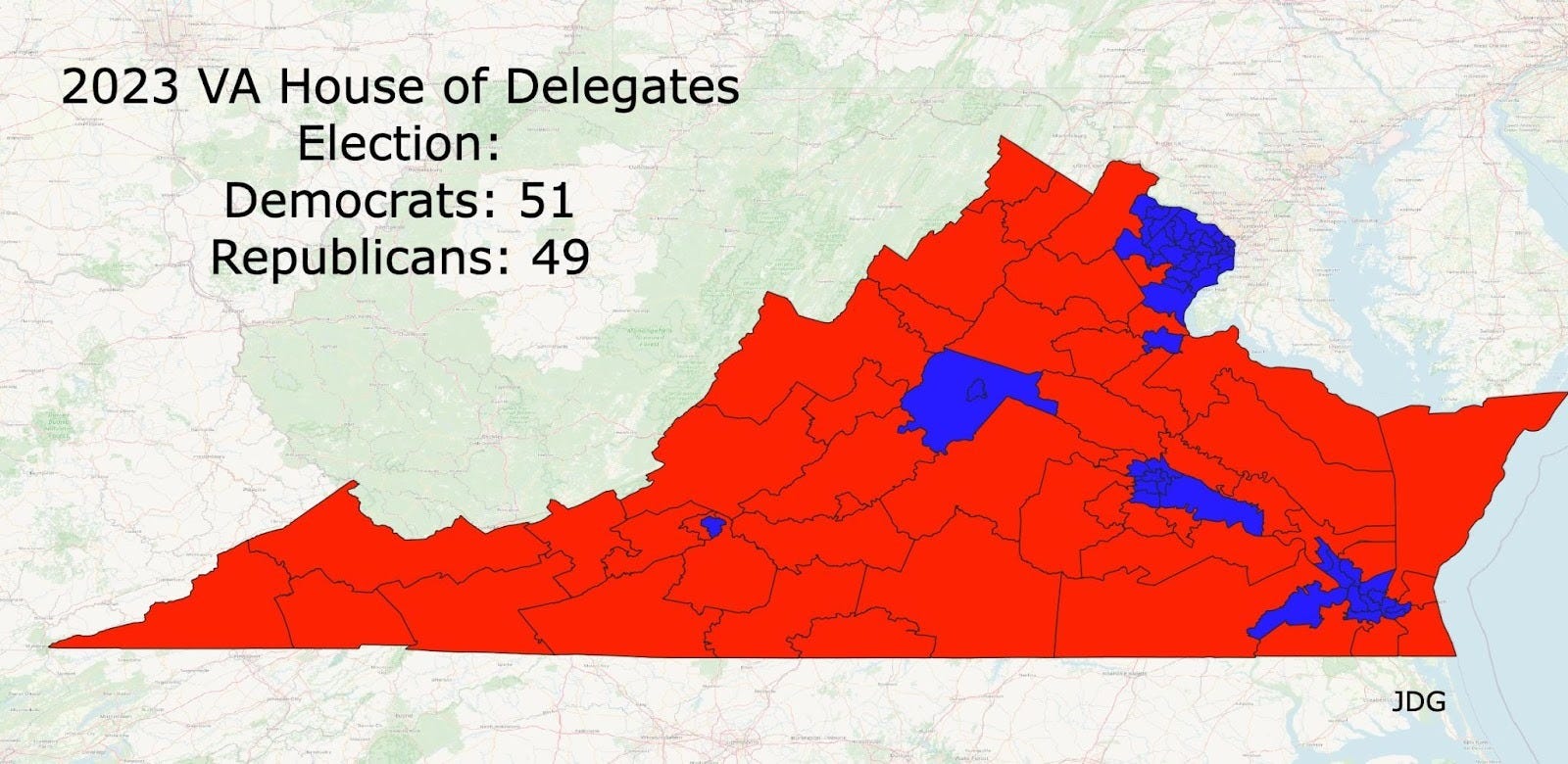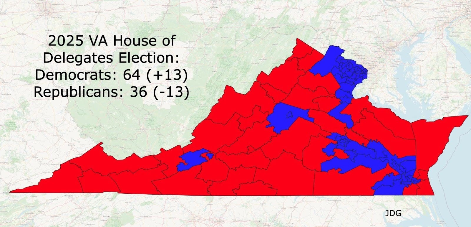 Democrats flipped 13 seats, increasing their total from 51 to 64, almost a supermajority. That’s the best showing for Democrats in the chamber since 1987. With the GOP’s desultory performance Tuesday, Democrats now are almost certain to gerrymander Virginia’s congressional maps before the 2026 election, netting Democrats three or possibly four seats.