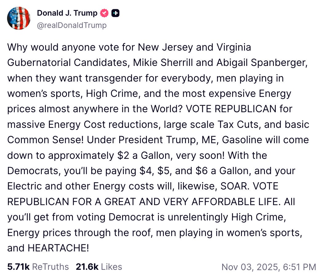 Obviously the most watched contest was in New York, where the mayoral election became a proxy battle in the Trump administration’s war on cities. Turns out, people resent having their tax dollars used to extort them into voting for someone odious — especially when they contribute tens of billions of dollars more they get back to the federal fisc every single year. And Mikie Sherrill and Abigail Spanberger’s resounding victories in the New Jersey and Virginia gubernatorial elections confirm that Republican policies are really, really unpopular.