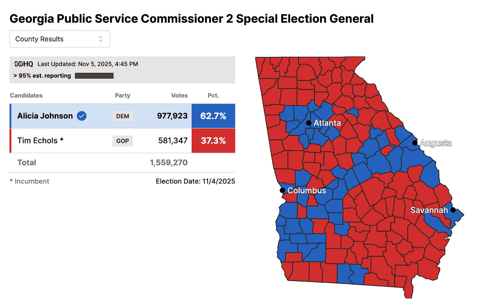Buoyed by anger over rising power costs, both Democrats cracked 60 percent of the vote — an ominous sign for the Georgia Republican Party as it heads into 2026, where it aims to defeat Sen. John Ossoff and defend its hold on the state house with Gov. Brian Kemp term-limited out. Democrats massively improved their performance across the state, but particularly in the suburbs and with rural Black voters, triumphing in counties Trump took by large margins, including one he won by 30 percent.