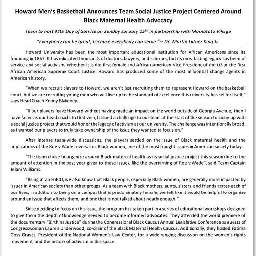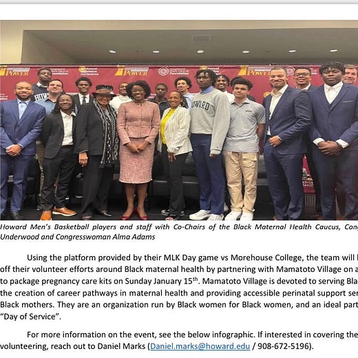 I also spoke with Jelani Williams, captain of the Howard University basketball team, which this year organized a social justice project on Black maternal health. The team’s work featured a day of service last month at Mamatoto Village in DC where players packed pregnancy and lactation kits, as well as a number of educational workshops aimed at making them informed advocates for Black moms, which in DC represent 90 percent of pregnancy-related deaths.