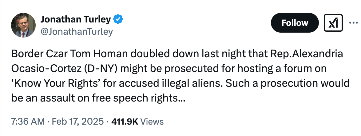 AOCâs defiance has also rallied bipartisan support from unexpected quarters. Fox News legal analyst and reliably shameless Trump stooge Jonathan Turley had to acknowledge despite himself that Homanâs threats were âbaselessâ and âan assault on free speech rights.â