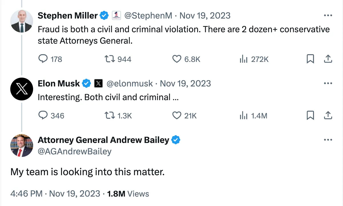 In that case, Trump viper Stephen Miller hissed out a demand for state attorney generals to prosecute Media Matters for the “fraud” of pointing out that ads for major brands were showing up next to pro-Nazi content, and Bailey fell all over himself to oblige.