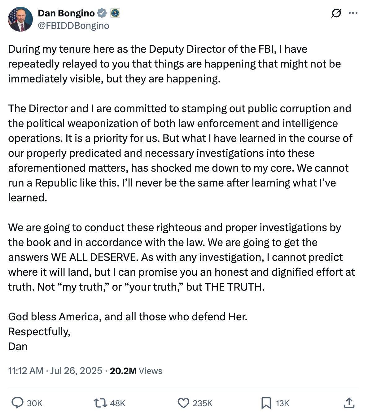 The problem appears to be that Bongino and his boss, FBI Director Kash Patel, are terrible at their jobs.
