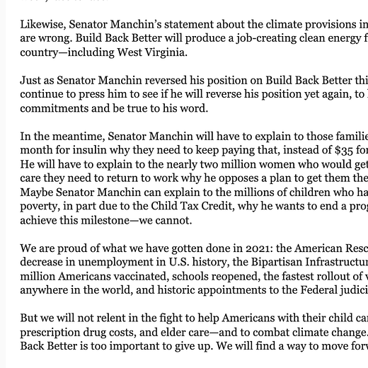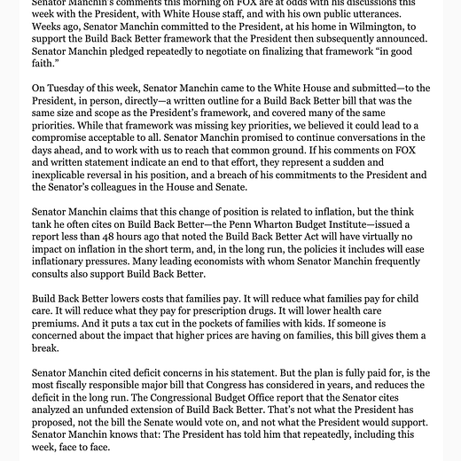 “Weeks ago, Senator Manchin committed to the President, at his home in Wilmington, to support the Build Back Better framework that the President then subsequently announced. Senator Manchin pledged repeatedly to negotiate on finalizing that framework ‘in good faith.’”