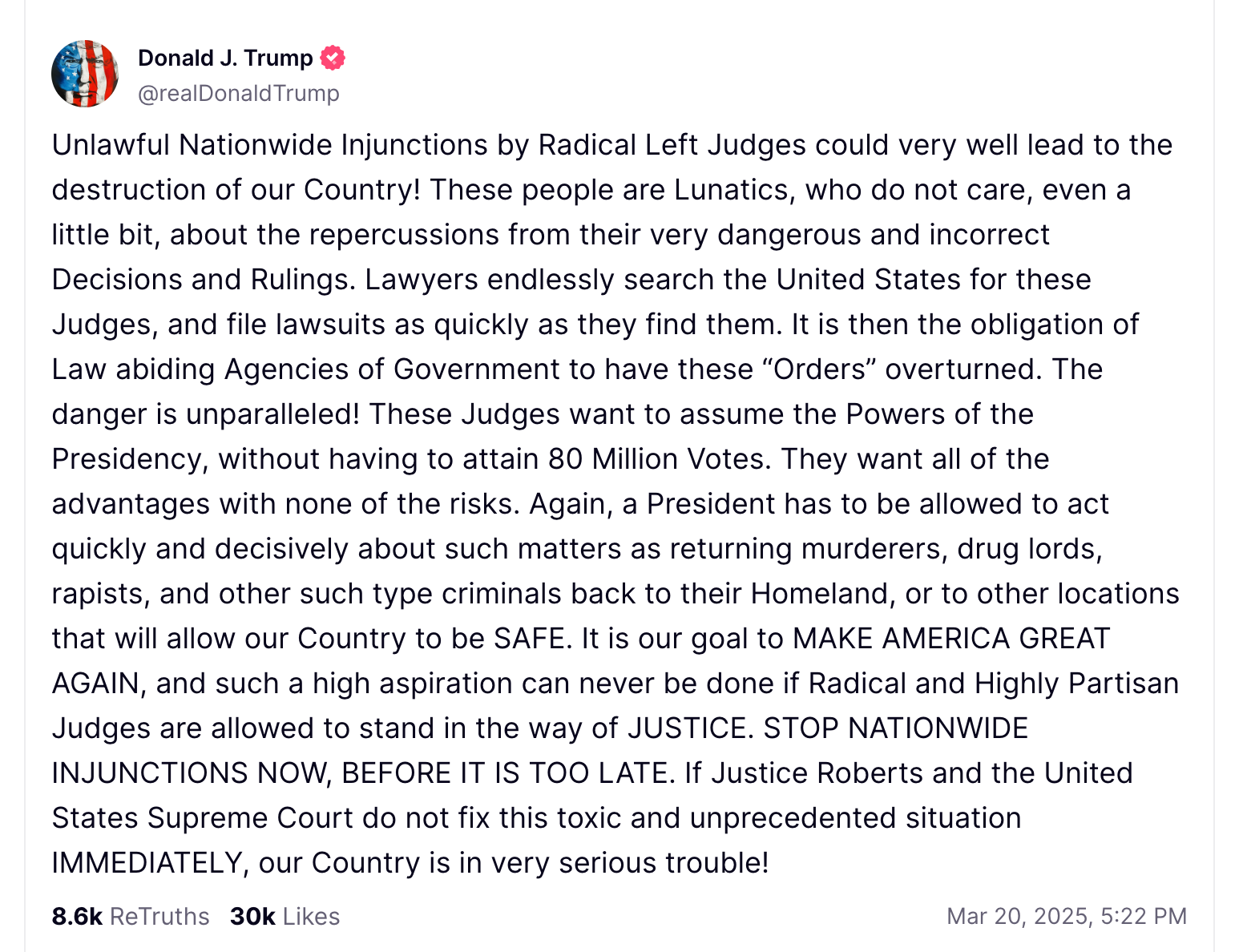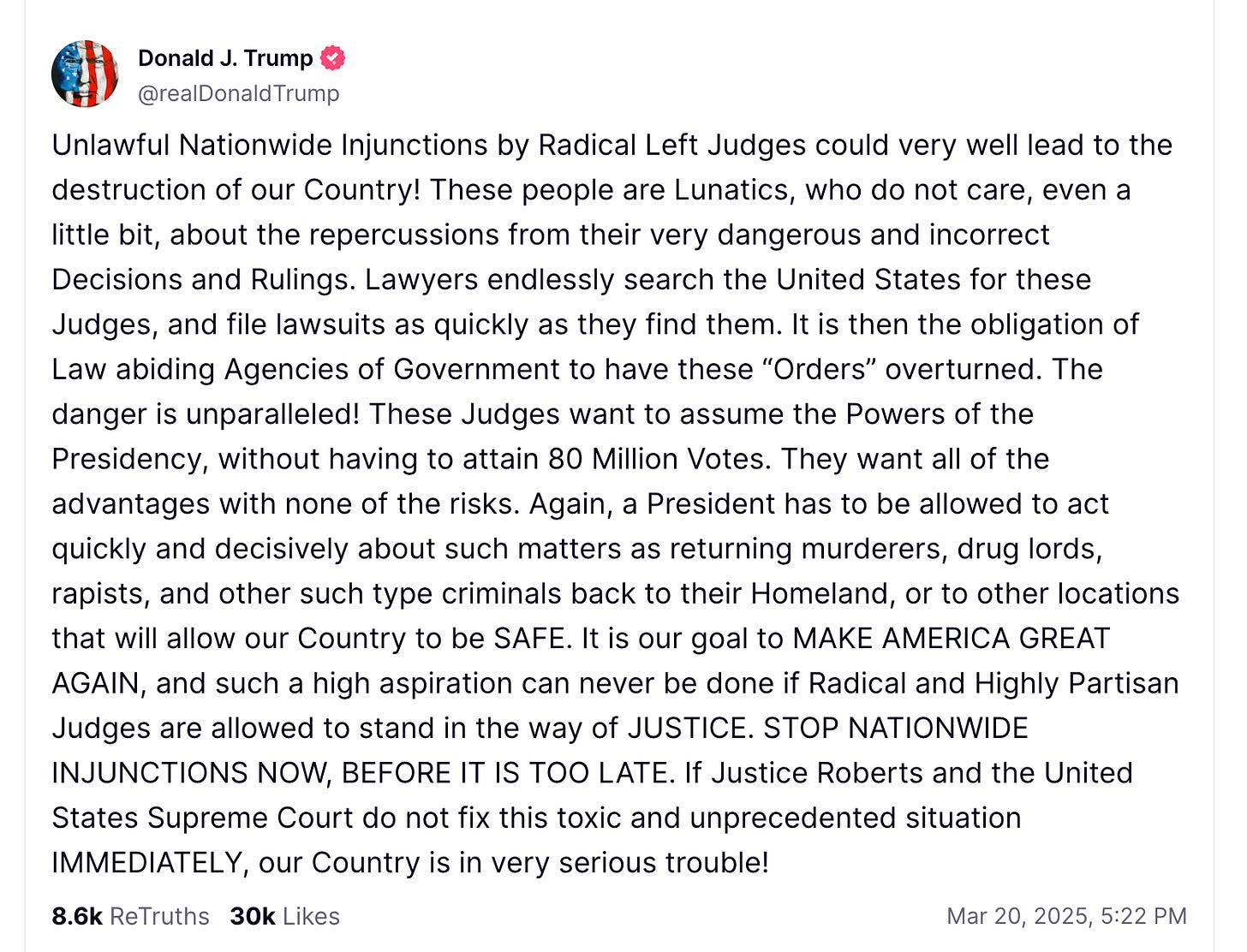 For example, the Court is now considering an “emergency” Trump challenge to a ruling staying his illegal effort to cancel millions of education grants because they are purportedly infected with “DEI” (that is, civil rights). Trump has also sought immediate Supreme Court review of whether trial judges properly issued nationwide injunctions against his patently illegal effort to erase birthright citizenship from the Constitution. And he just asked the Court to allow him to continue to send Venezuelans to a notorious Salvadoran prison without due process, on the dubious pretext they are wartime enemies.