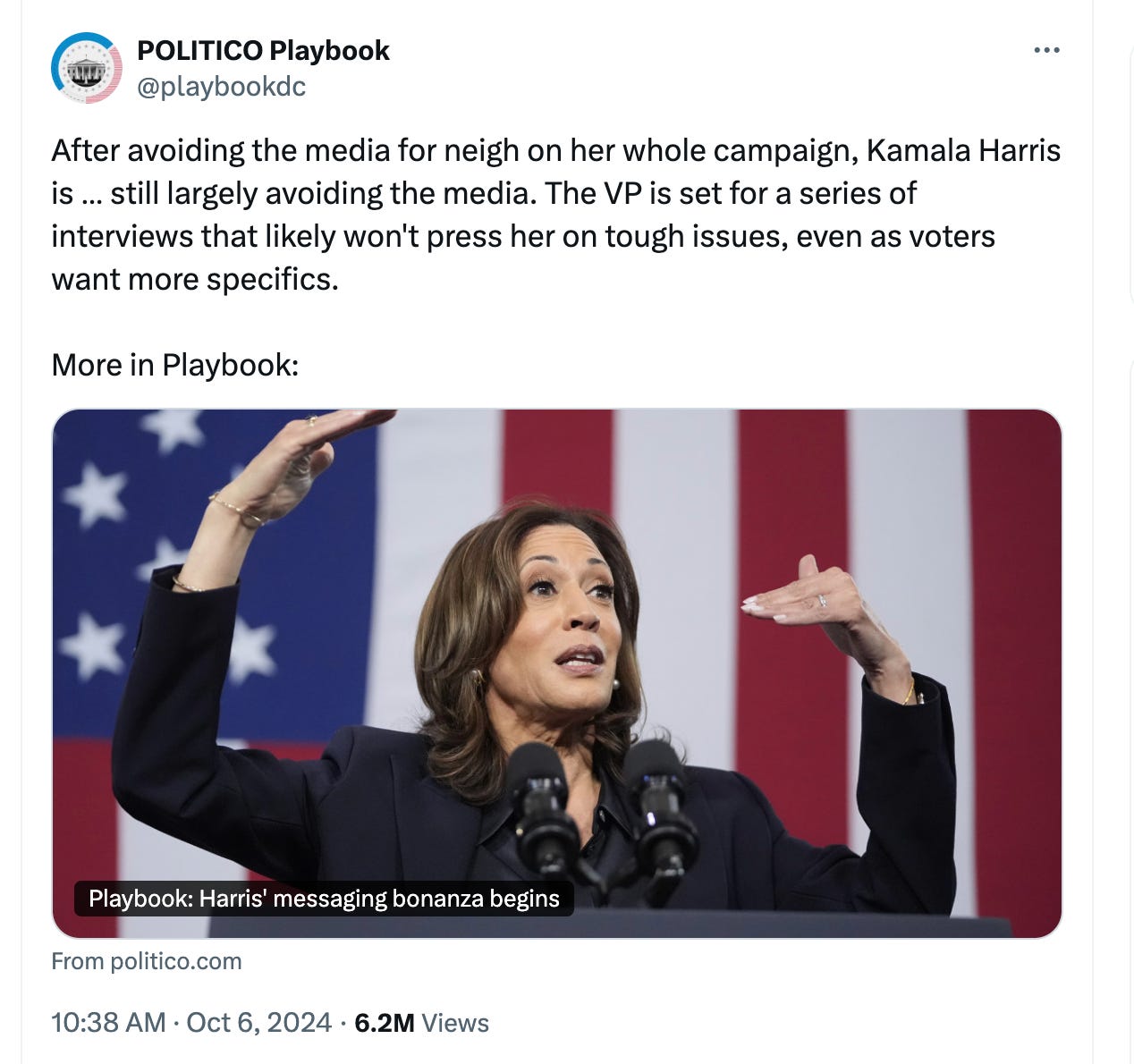 Then, last Sunday, Politico’s Playbook tweeted, “After avoiding the media for neigh on her whole campaign, Kamala Harris is … still largely avoiding the media.”