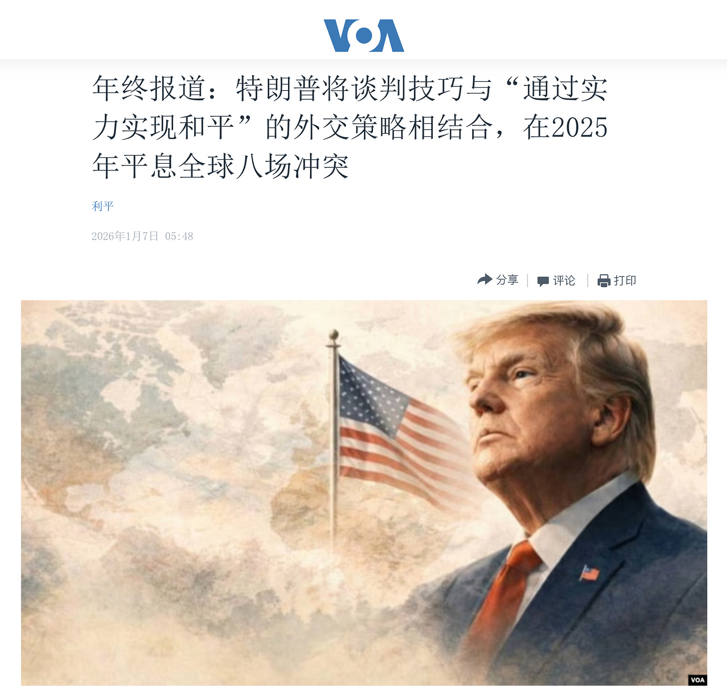 VOA’s Mandarin Service is being overseen by Hui Jing, another USAGM employee whose previous gig was at the Epoch Times (a rabidly pro-Trump/anti-CCP outfit which is implicated in a massive money laundering scheme). One January 2026 article, which featured an AI-generated image of Trump superimposed over an American flag and a world map, touted his “dealmaking ability” in resolving eight global conflicts — language lifted nearly verbatim from White House press releases. The piece reads less like VOA journalism and more like something produced by the White House communications shop … which is exactly how Lake views her role.