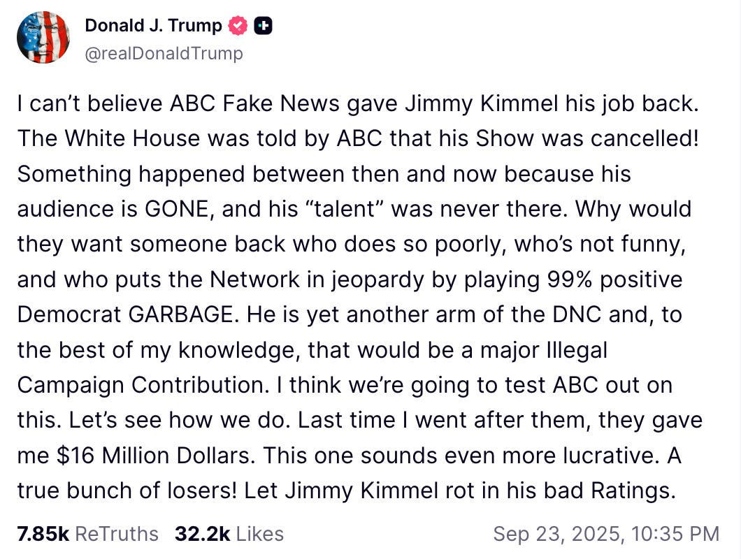 Kimmel’s monologue was viewed more than 15 million times in the first 24 hours. And Disney’s decision to reverse its call to yank Kimmel off ABC felt like a turning point — the weaponized federal government is scary, but a million streaming subscription cancellations is scarier.