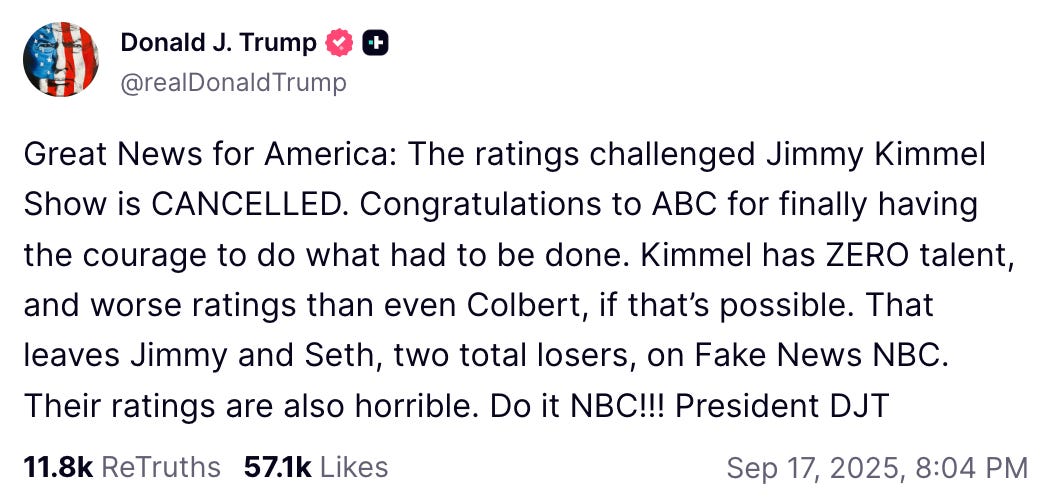 Arm-twisting Paramount appears to have emboldened Carr as much as it did Trump. In multiple media outlets, he suggested that the FCC would move against ABC if it didn’t take Kimmel off the air. The threats culminated with a September 17 appearance on rightwing podcaster Benny Johnson’s show.