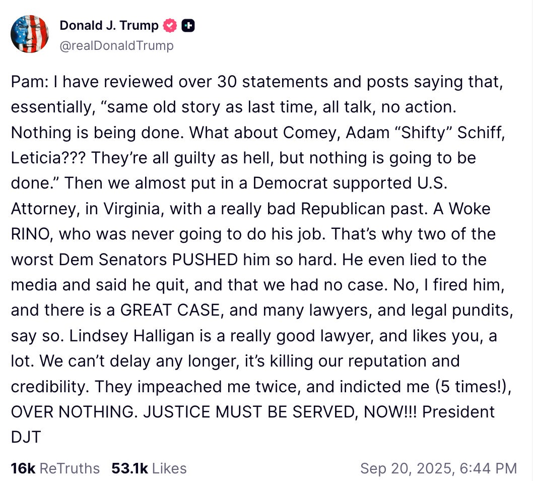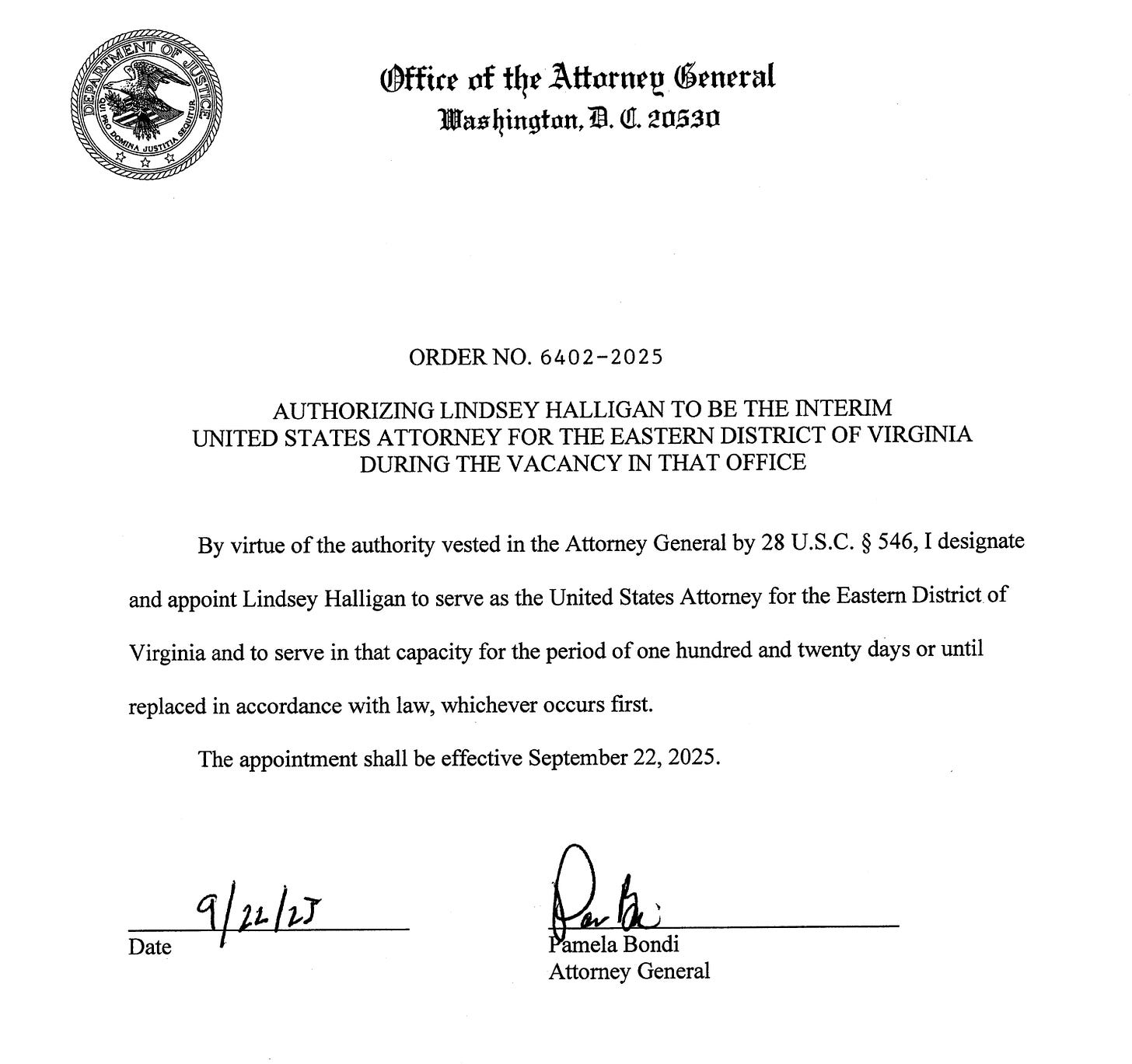 As we detailed last week, Halligan was appointed US Attorney in EDVA, one of the busiest dockets in the world, for the express purpose of indicting Trump’s enemies, New York Attorney General Letitia James and former FBI Director James Comey.