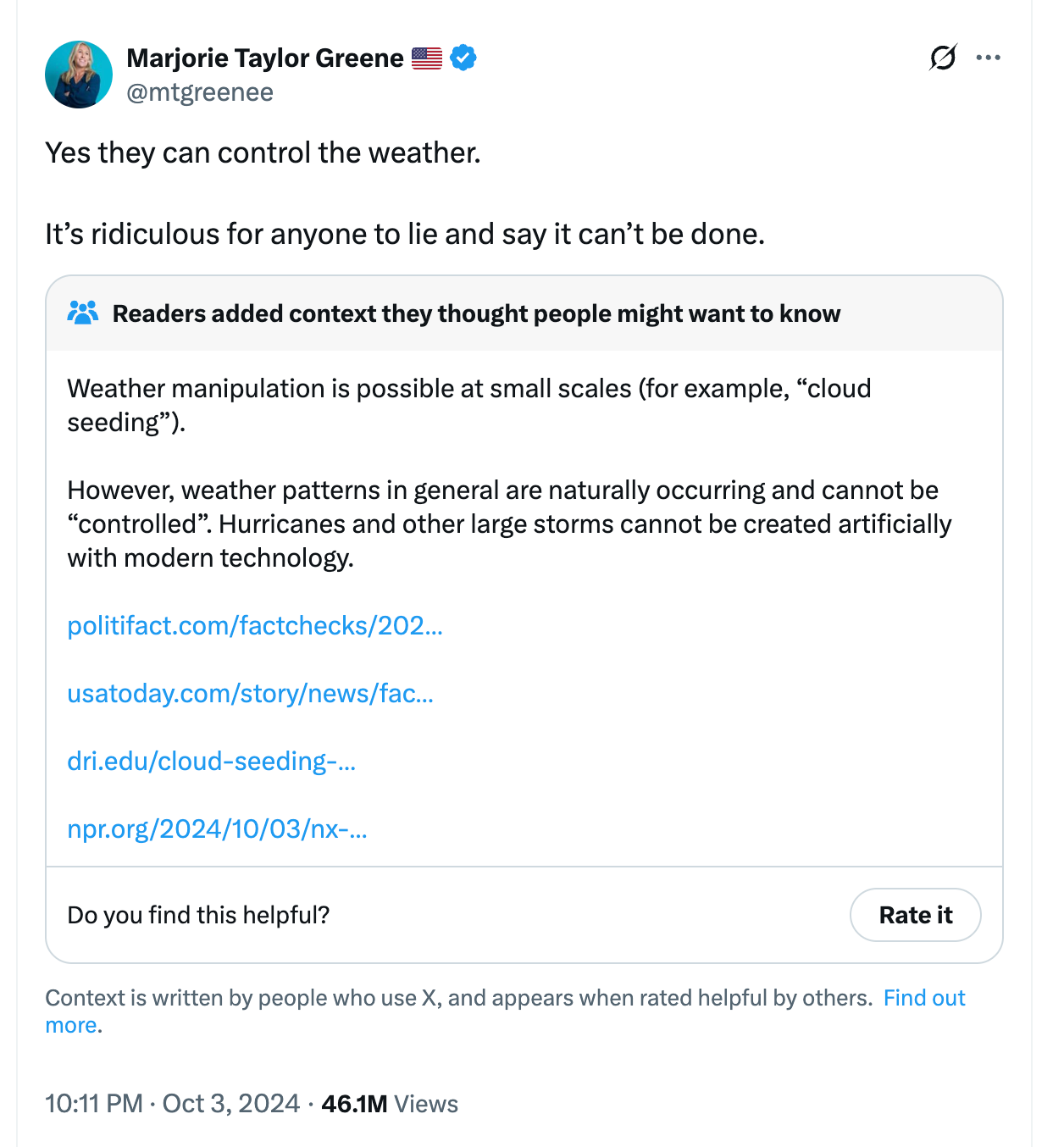 And there’s much more. Greene repeatedly misgendered trans officials and colleagues and lied that they were child abusers. In 2022 she attacked the Catholic church for its support of immigrants and claimed it was being controlled by Satan. Perhaps the most iconic Greene nonsense is her claim in 2018 that California wildfires were being caused by lasers fired from satellites controlled by the Rothschild family. Greene disavowed those comments, but in October 2024 — about a year ago — she suggested the government under President Biden was controlling the weather and targeting Florida with a dangerous hurricane.