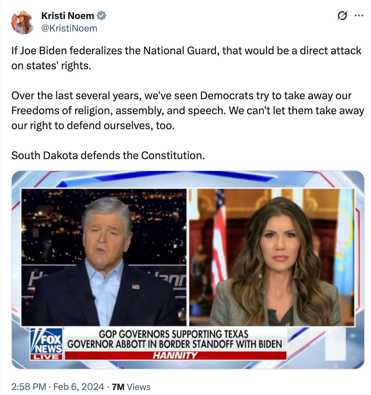 Aside from Vermont’s Phil Scott, every Republican governor in the country publicly supported Abbott thumbing his nose at the federal government. This included then-South Dakota Gov. Kristi Noem, who proclaimed that if “Joe Biden federalizes the National Guard, that would be a direct attack on states' rights.”
