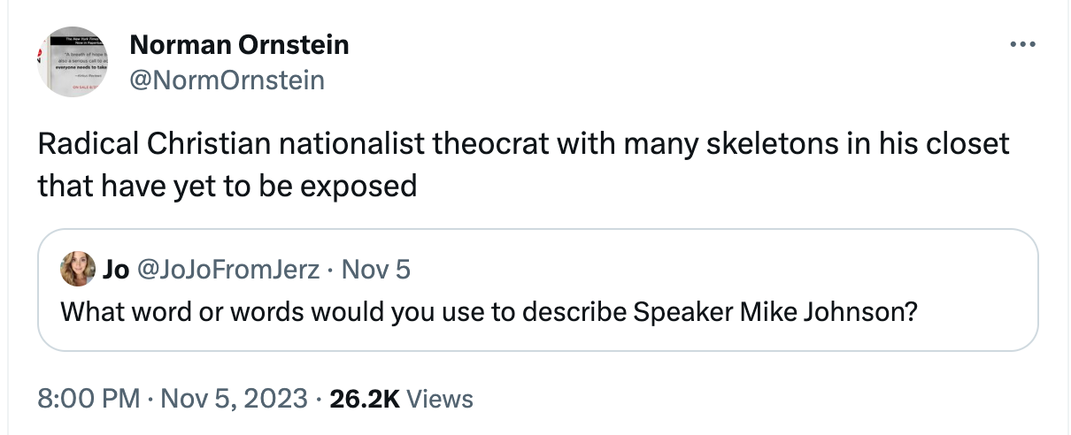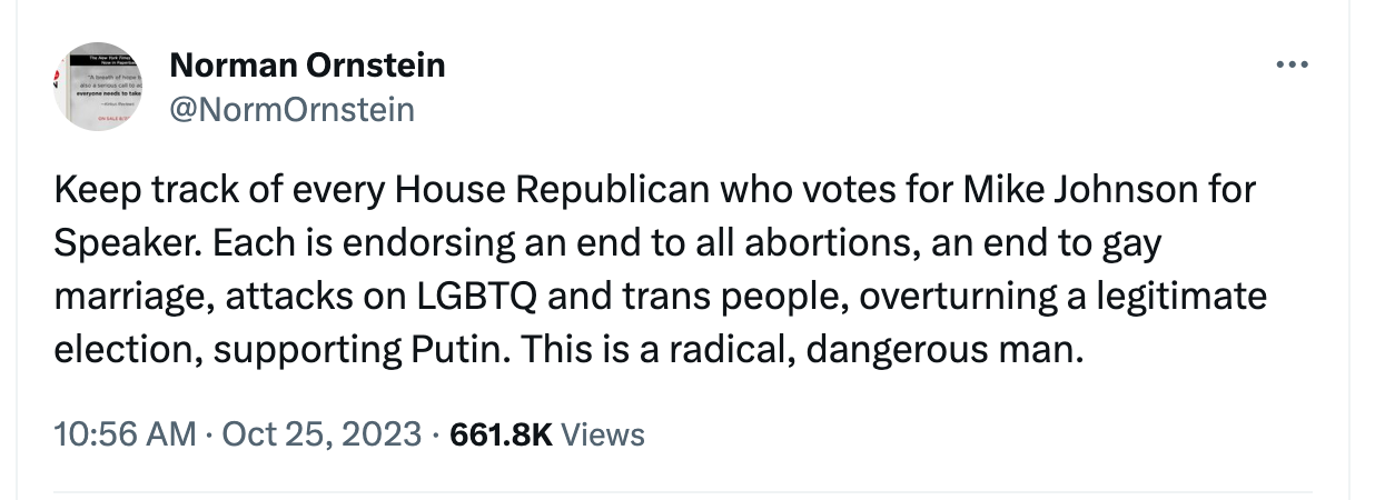 Ornstein has been a public intellectual for nearly 50 years. If nothing else, you probably know him from twitter, where he’s recently been sharing some spicy (and accurate) takes about the new speaker.