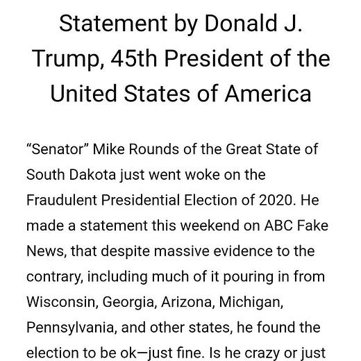 Nonetheless, on Monday morning Trump released a scathing statement that began by lamenting that “‘Senator’ Mike Rounds of the Great State of South Dakota just went woke on the Fraudulent Presidential election of 2020.”