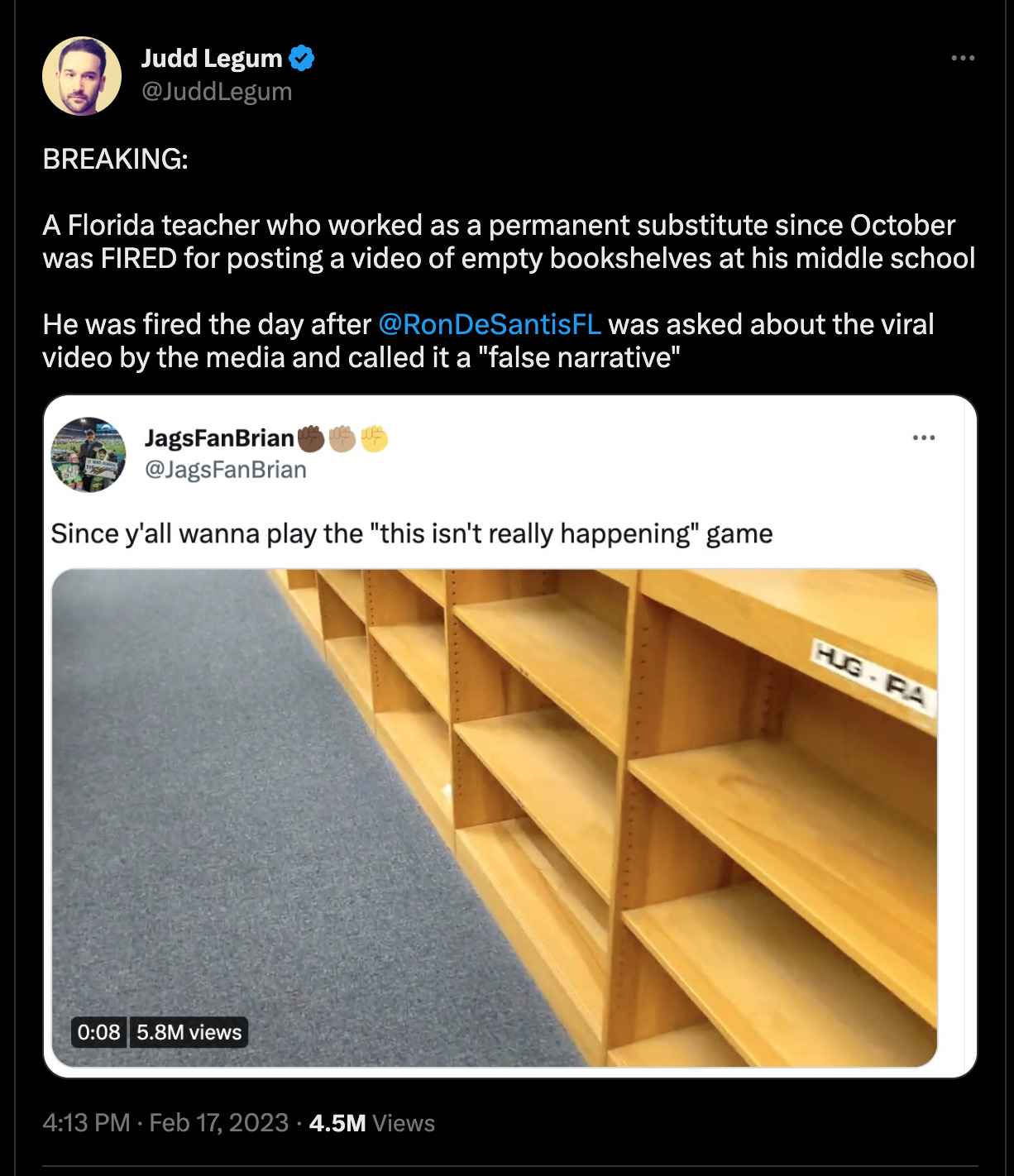 Ron DeSantis is on a mission to impose his regressive worldview on Florida schools. We’ve seen pictures and videos of empty bookshelves because education officials are worried about violating a new Florida law restricting discussion of race and identity. He’s also gotten into a fight with the College Board over an AP African American studies course, and completely taken over a formerly progressive institution called the New College.