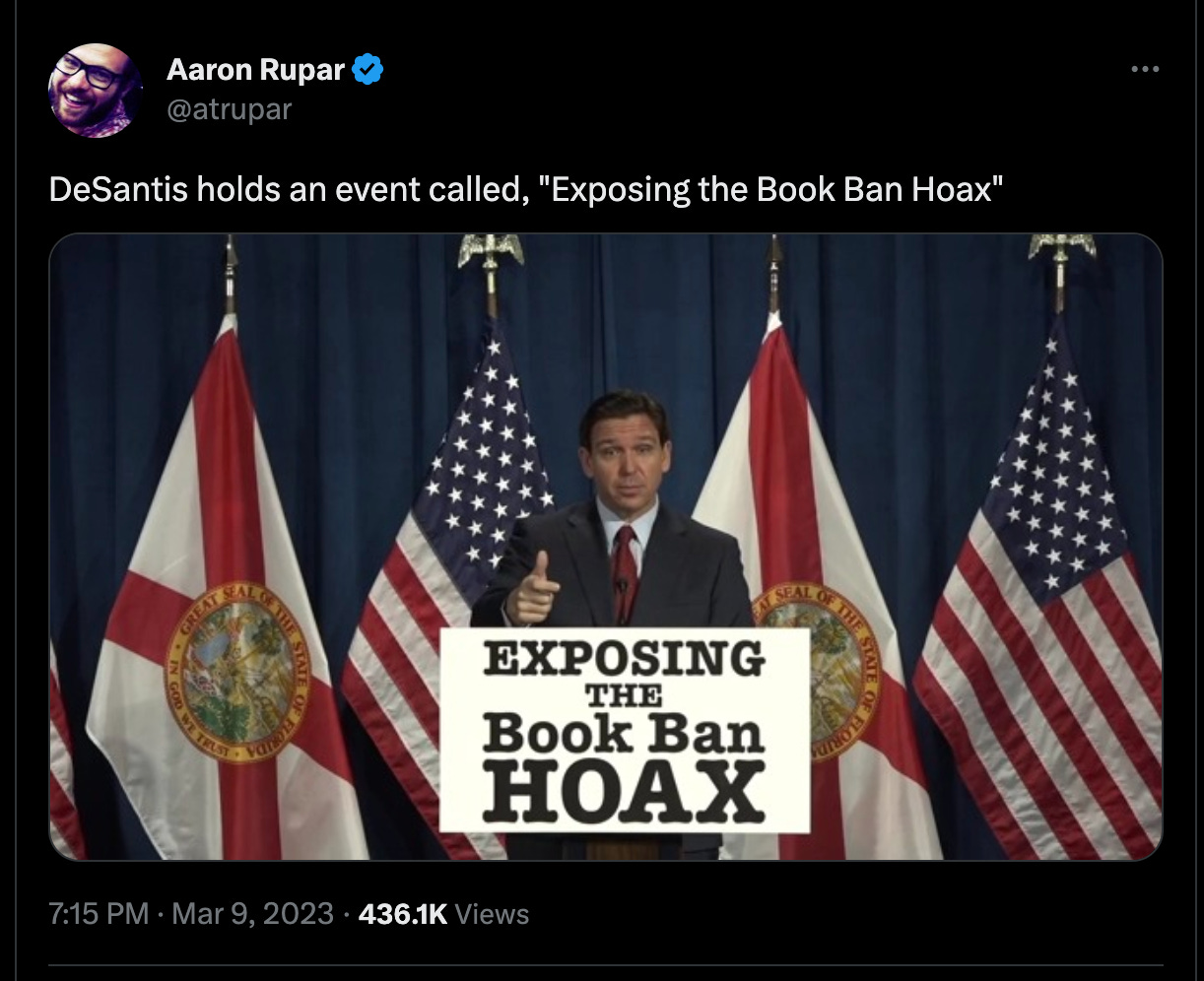 It’s definitely happening, so I’m not sure why he’s saying that. Just to give you an example: In Duval County they have 1.6 million books. Except for the elementary schools, they don’t even really have media specialists in Duval County. They have about 54 in the whole district. So far they’ve been able to review 6,000 of their 1.6 million books. The books that aren’t approved are not available to students.