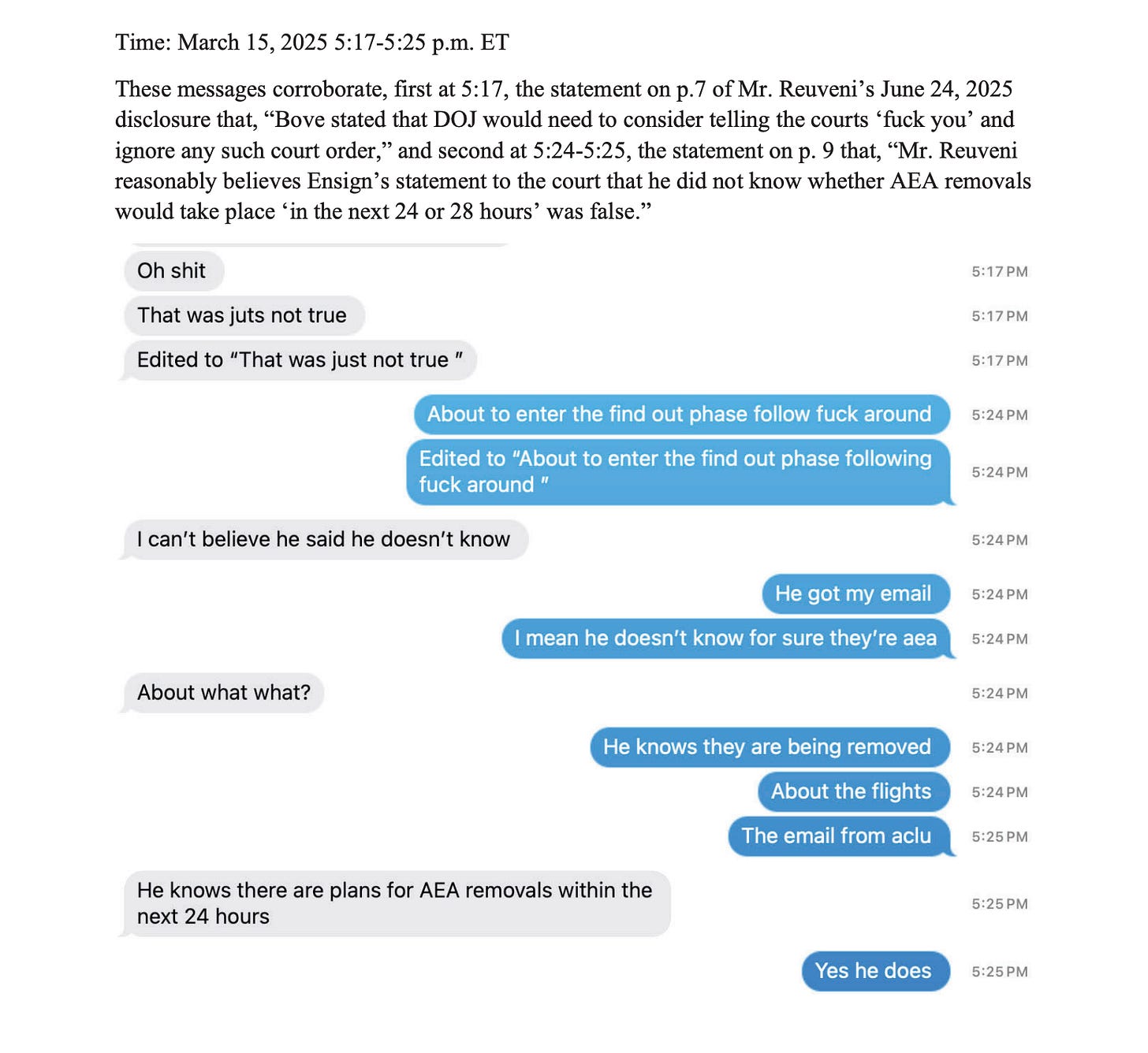 Notwithstanding the court’s explicit order, the government did not turn around a flight of detainees that was already in the air. And during the pause in the proceedings when Ensign was supposed to be ensuring that DHS would comply with the ruling, two additional flights took off from Texas. A subsequent whistleblower report alleged that Ensign was well aware that the flights were taking off imminently and simply lied to the court.
