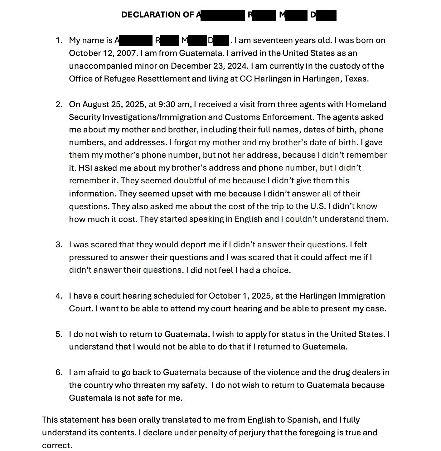 Another child testified that, on August 25, three Homeland Security agents showed up and demanded her family’s contact information. She says she’s scared of returning to Guatemala because of “drug dealers in the country who threaten my safety.”