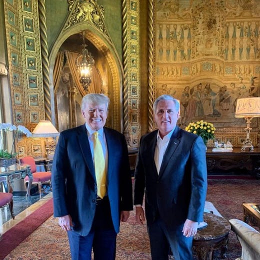 McCarthy, notoriously, declined to whip his members to vote in favor of confirming the results of the 2020 election, resulting in a majority of them voting to nullify the results in the wake of the insurrection. Then, after he briefly criticized Trump following January 6, McCarthy appeared at Mar-a-Lago, where he publicly associated himself with Trump and his coup attempt.