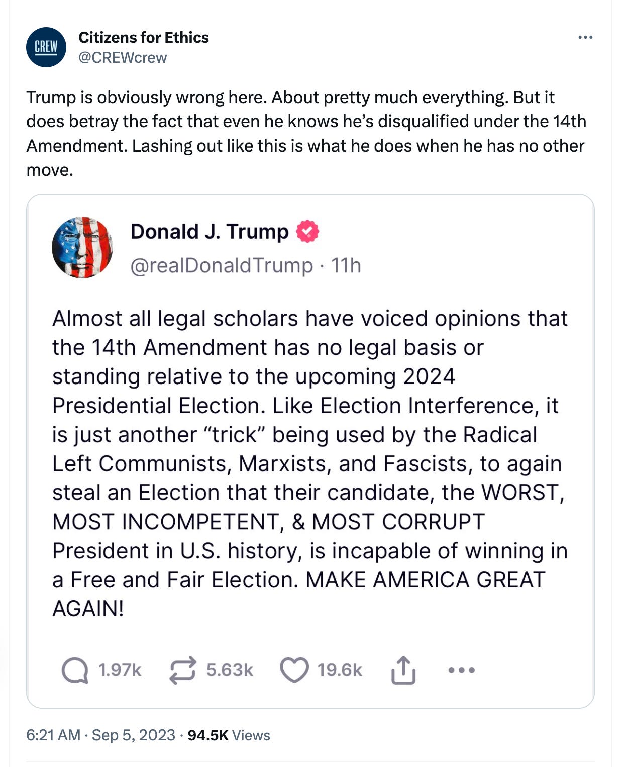 While the text of the Constitution is very clear, there are at least a few obvious counterarguments to CREW’s position. One is a principled case that the decision to reject or elect Trump should be left to voters, not the courts. The second is procedural. Trump would obviously appeal any state-level decision to disqualify him all the way to SCOTUS, and it’s hard to imagine a court he stacked ultimately ruling against him. Finally, the 14th Amendment was adopted in the wake of a very bloody four-year-long Civil War, and it’s debatable whether Trump’s leading role in the January 6 attack rises to that level of “insurrection.”