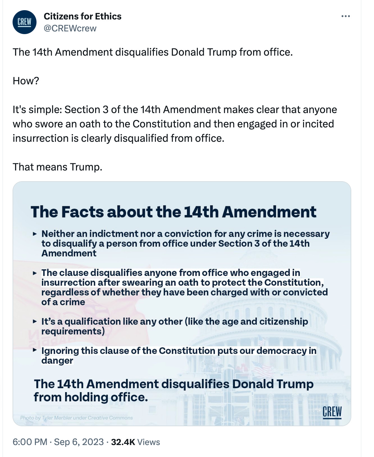 In July, CREW released a detailed report making the case that Trump’s efforts to overturn his loss to President Biden meet the bar of engaging in insurrection, and hence for constitutional disqualification. This isn’t some desperate liberal Hail Mary. Two prominent conservative law professors, William Baude and Michael Stokes Paulsen, recently authored a paper arguing that Section 3 “disqualifies former President Donald Trump, and potentially many others, because of their participation in the attempted overthrow of the 2020 presidential election.” Secretaries of state in a range of states, including battlegrounds like Arizona and Michigan, have already indicated they plan to take seriously potential 14th Amendment challenges. And a precedent was established last year when a state judge in New Mexico removed country commissioner Couy Griffin from office, citing the 14th Amendment and Griffin’s participation in January 6.