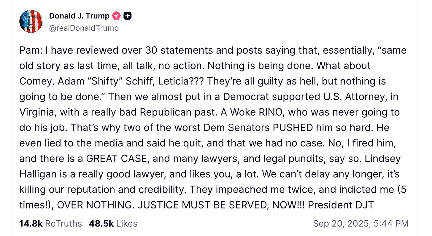 Because everything is terrible but also very stupid, it wasn’t clear whether Trump intended this missive to be a DM to Pam Bondi or for public consumption, particularly since it seemed to be addressed to her. Trump deleted the initial post, only to re-up it with one minor change, which was to add a last name, Halligan, to the “Lindsey” mentioned in the original. (More on Ms. Halligan later.)