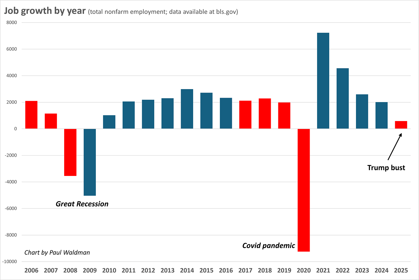 But just 50,000 jobs were added in December, bringing the grand total for 2025 to an abysmal 584,000. Other than the depths of the Great Recession and the covid pandemic, job growth in the first year of Trump’s second term was the worst in over two decades.