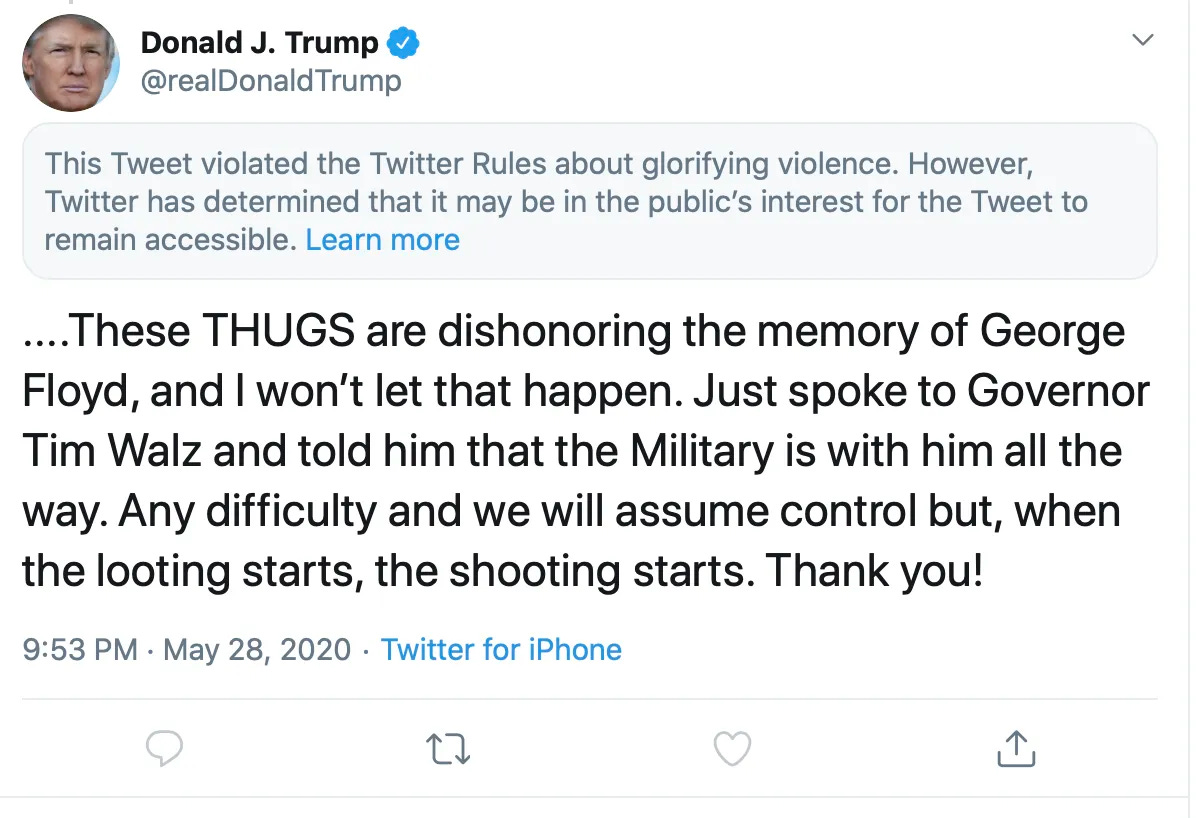 Trump has long expressed a visceral desire to foment violence between city residents and police. His deep attraction to such chaos and destruction was perhaps best expressed in a May 2020 tweet — posted in the midst of the unrest in Minneapolis that followed George Floyd’s slow strangulation — that declared “when the looting starts, the shooting starts.” (It was properly flagged for glorifying violence.)