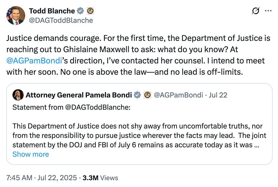 And so Bondi and Blanche, Trumpâs personal lawyers put in charge of running the DOJ, are turning to a convicted sex trafficker serving what is effectively a life sentence with an offer she canât refuse â if she knows whatâs good for her.
