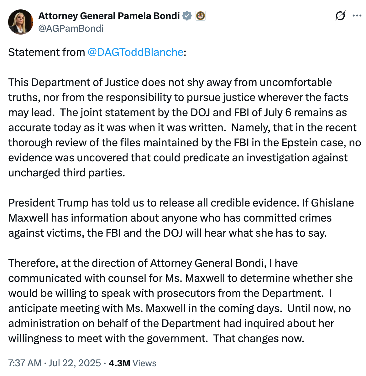 Now Bondi, who insists that her shop âdoes not shy away from uncomfortable truths,â announces that sheâs eager to sit down with a convicted sex trafficker and hear what she has to say. Presumably this curiosity does not extend to confirmation of the Journalâs reporting about smutty birthday scribbles âamong the documents examined by Justice Department officials who investigated Epstein and Maxwell years ago.â (Nor does it extend to Kilmar Abrego Garcia, the man she illegally deported to a gulag and then falsely accused of being a human trafficker.)