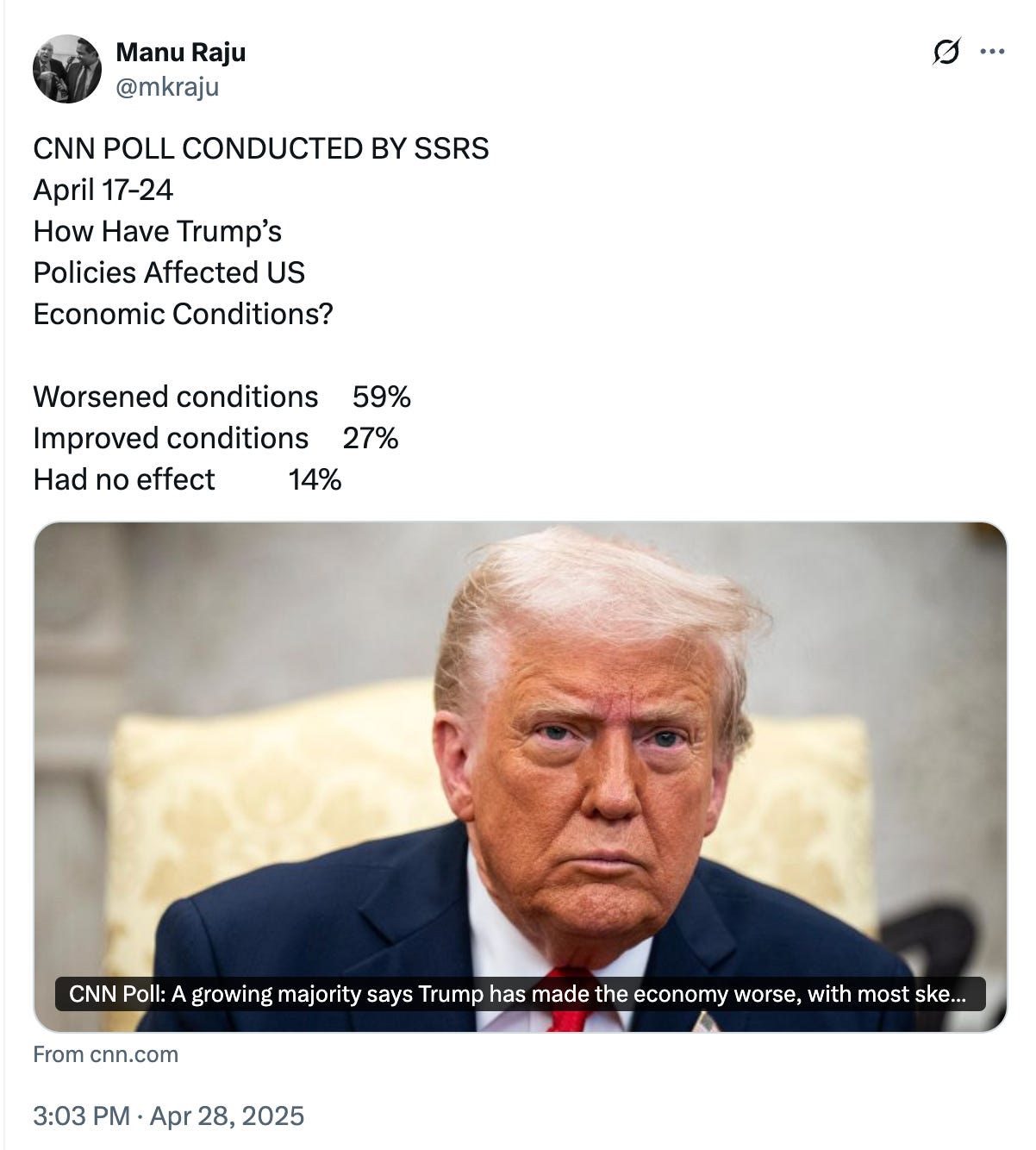 The American public is noticing. A CNBC poll found that Trumpâs numbers on the economy were the worst of his entire presidential career. US consumer sentiment has plummeted; in April it dropped to 52.2, the fourth lowest level since 1952. Overall, in Morrisâs aggregates, Trumpâs net approval is -13.6 on the economy as a whole. Itâs a shocking -21.5 on inflation â one of the issues he made a centerpiece of his 2024 campaign.