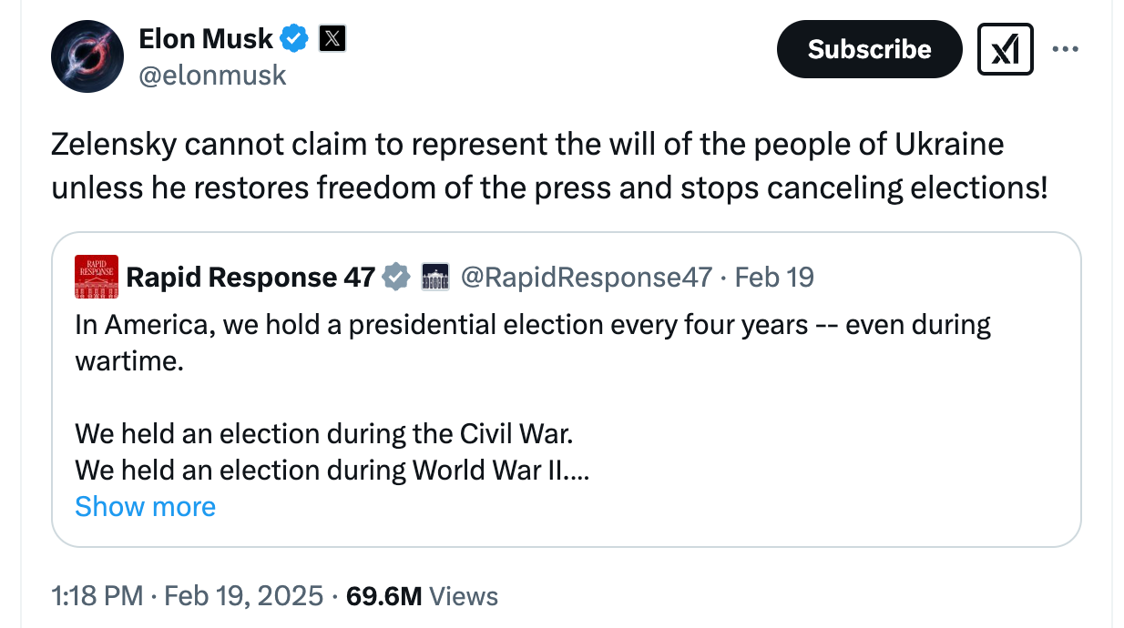For instance, right after Trump smeared President Zelenskyy as a “dictator,” Musk pushed the false narrative on X, which was dutifully picked up on Fox News when Laura Ingraham boasted about how Trump doesn’t “bow to dictators.” This is all legally protected free speech but it is clearly propaganda.