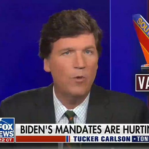 On Monday, for instance, Carlson devoted a segment to lauding Southwest Airlines pilots who called in sick instead of reporting to work to protest the company’s vaccine mandate.